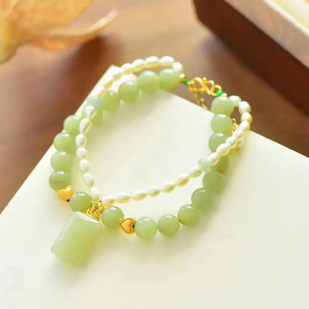 天然青玉和田玉淡水珍珠雙層手鏈