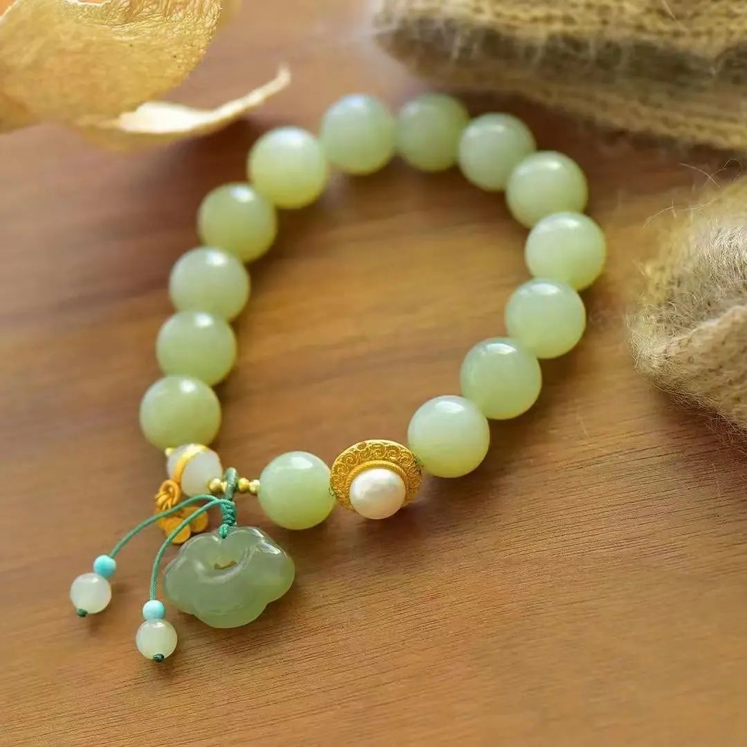 天然青玉和田玉如意鎖大珠珠手鏈