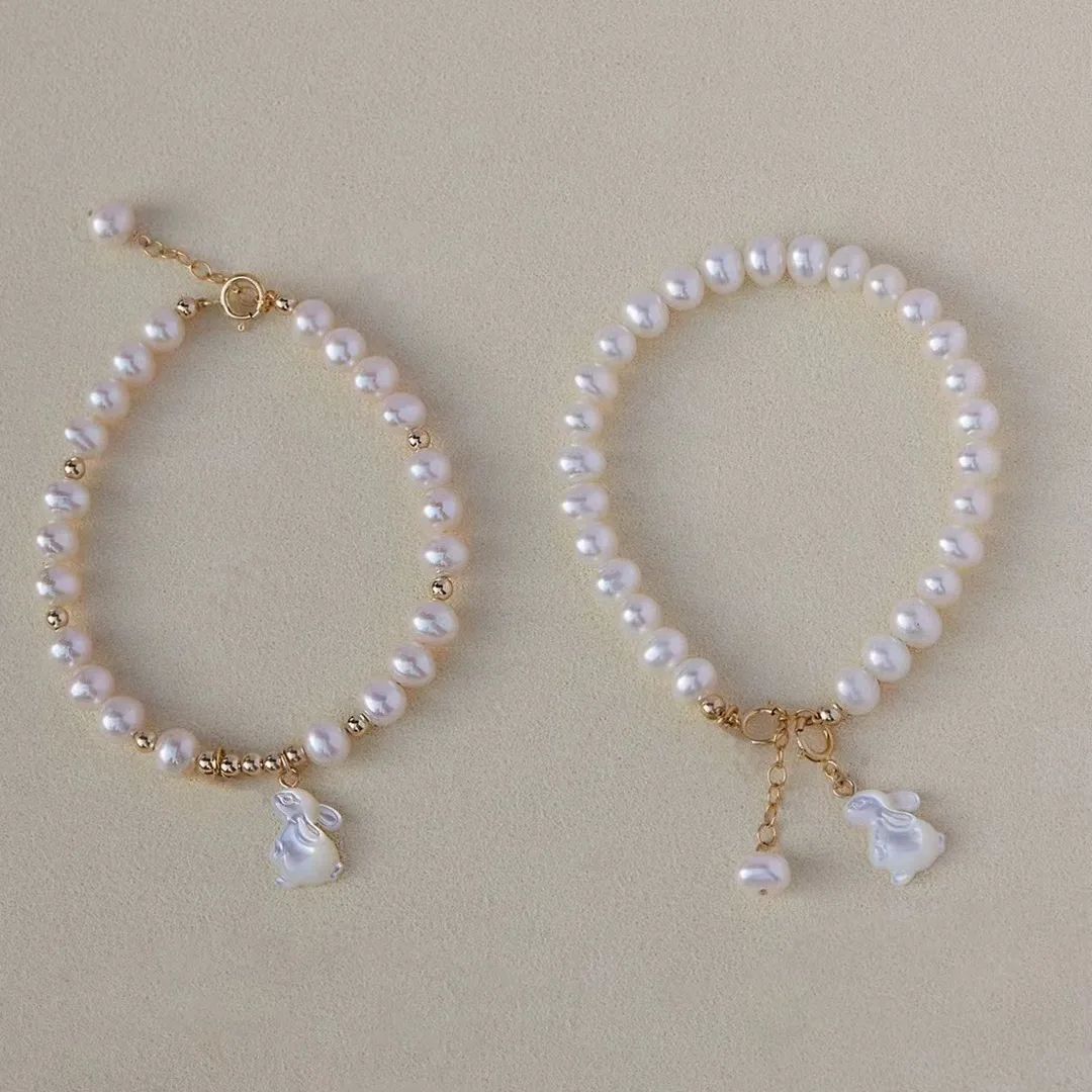 天然淡水mini珍珠白貝母兔仔14k包金手鍊
