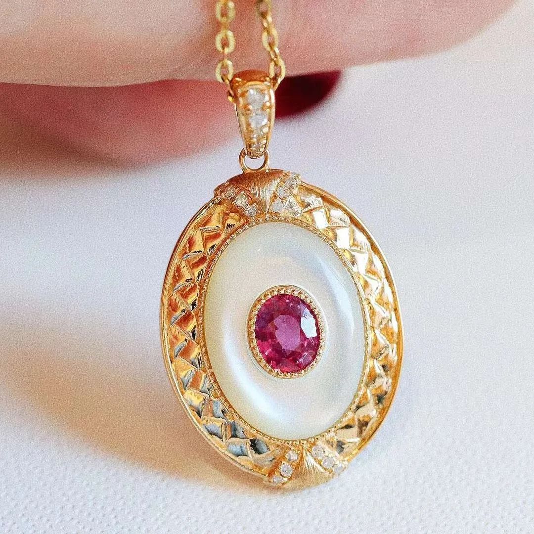 天然無燒紅寶石鑽石18k金白貝宮廷風吊墜