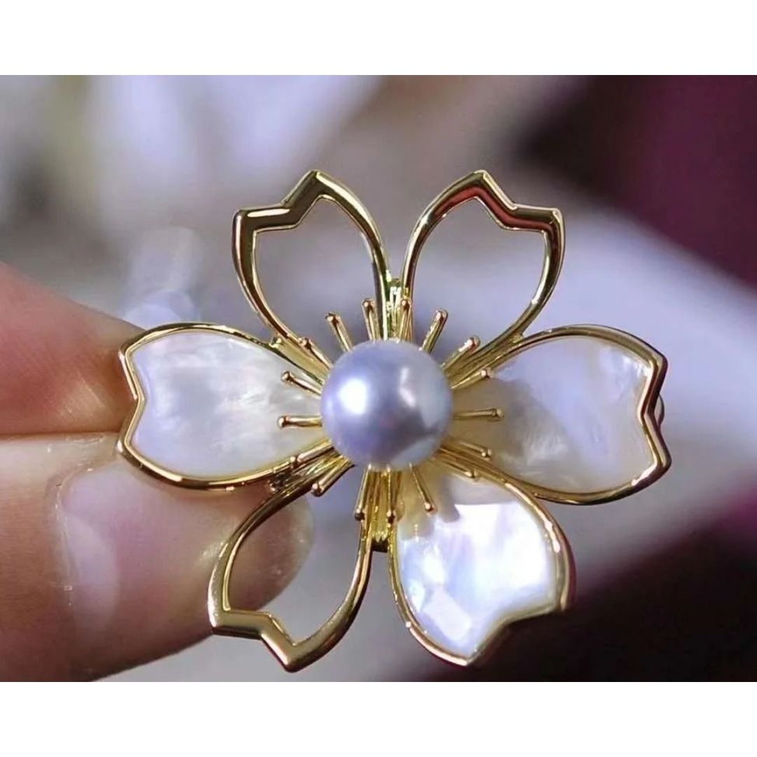 天然白貝925銀櫻花海水真多麻胸針。