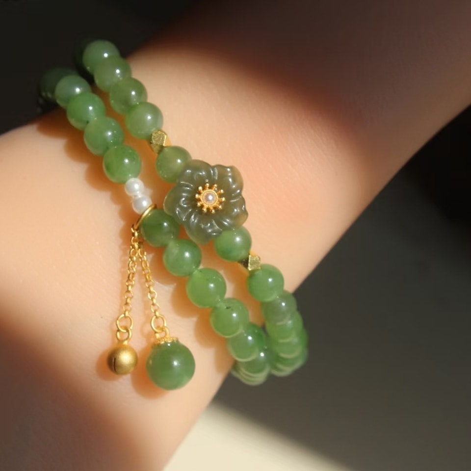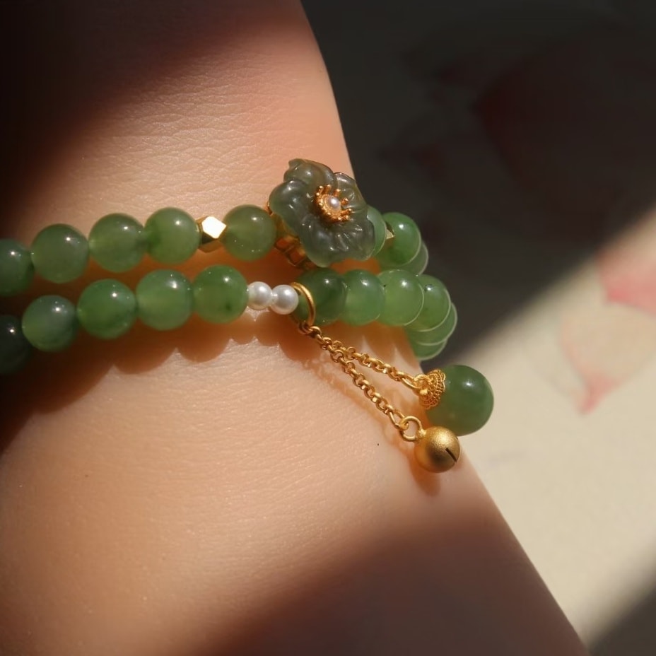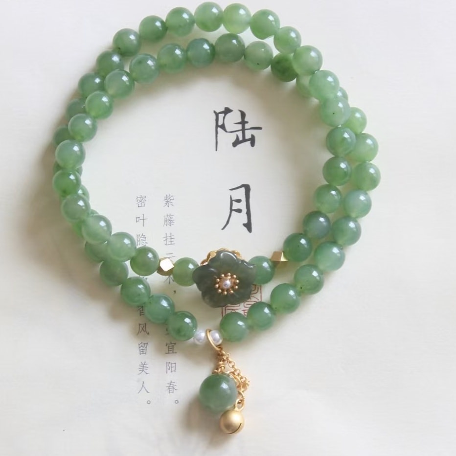 天然碧玉手鍊,雙圈手串。 珠徑6mm適合手圍15cm左右 【其他尺寸可以訂製】。 材質:碧玉圓珠、s925銀鍍金鑲和田玉桃花、s925銀鈴鐺+碧玉吊墜、珍珠。 hkd$1100,包順豐,證書 —— 保證a貨 如假包退。 我哋有證書,支持任何形式嘅复檢 可以代出香港證書+250