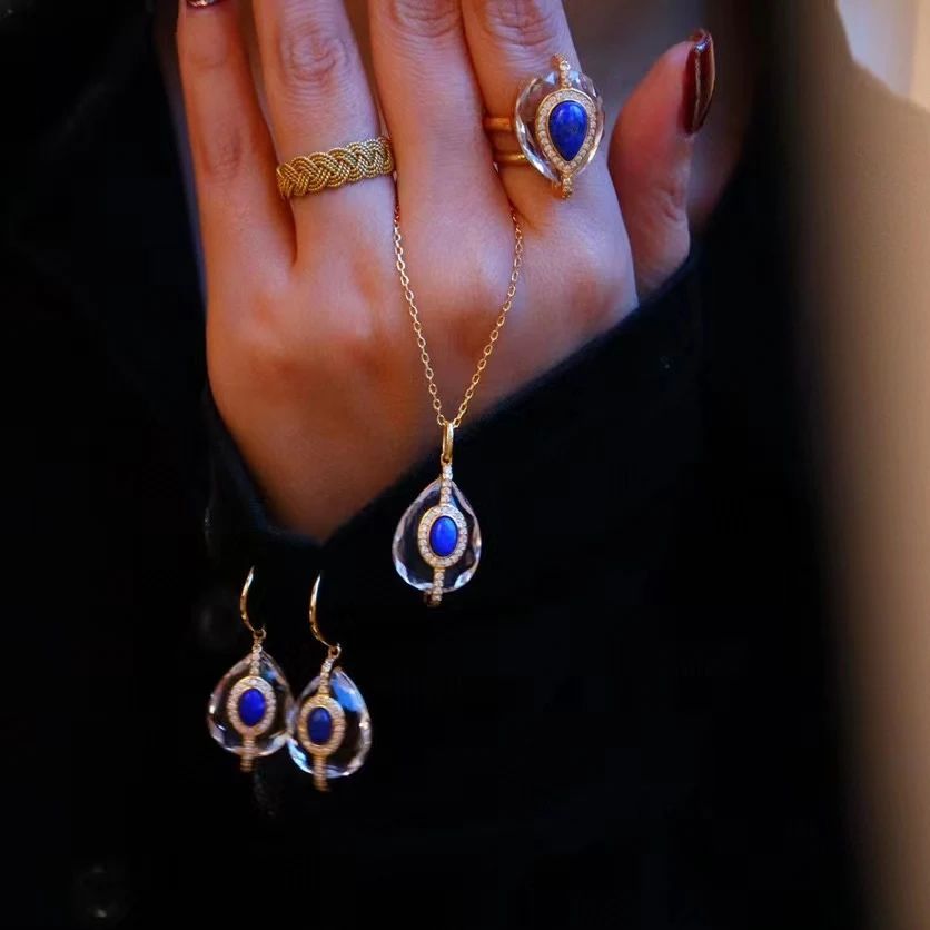 天然青金石925銀鎏金水滴白水晶耳環/戒指/頸鏈