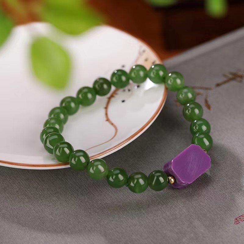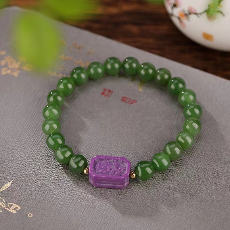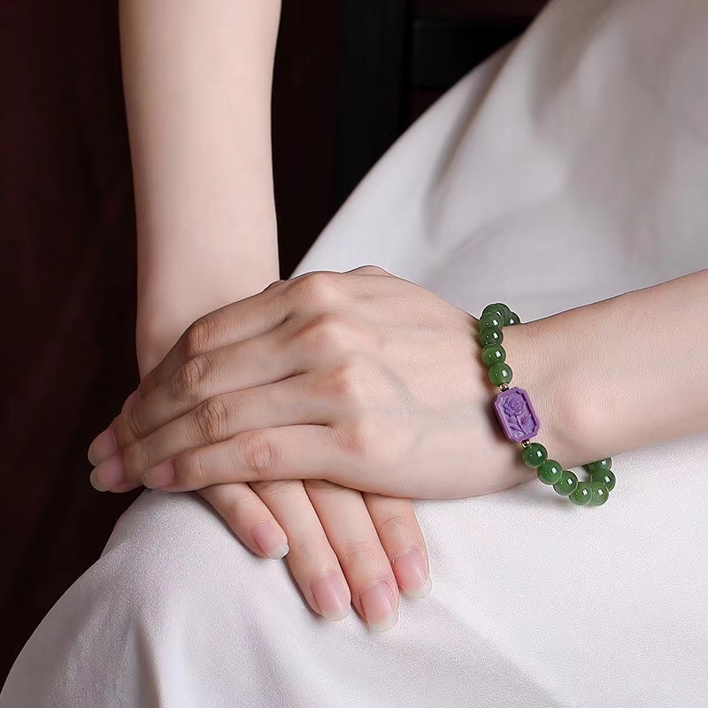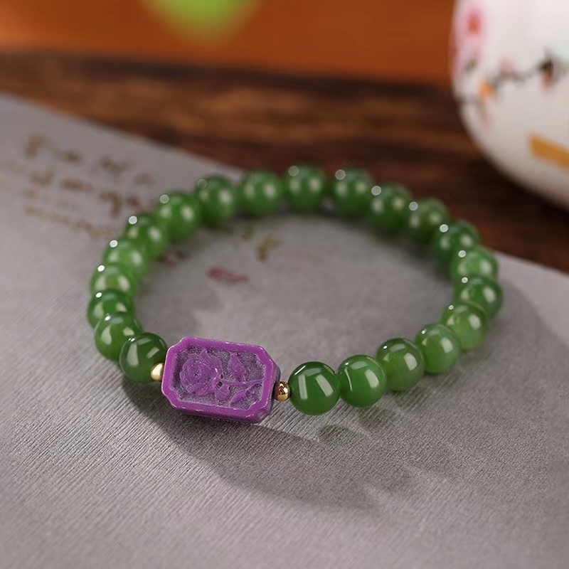 紫雲母和田碧玉氣質手工雕刻玫瑰花牌圓珠手鏈
