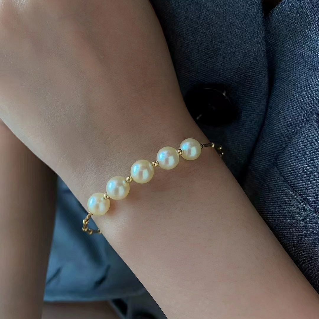 18k金日本海水akoya(香檳金色)珍珠粗金彈力手鐲😘😘