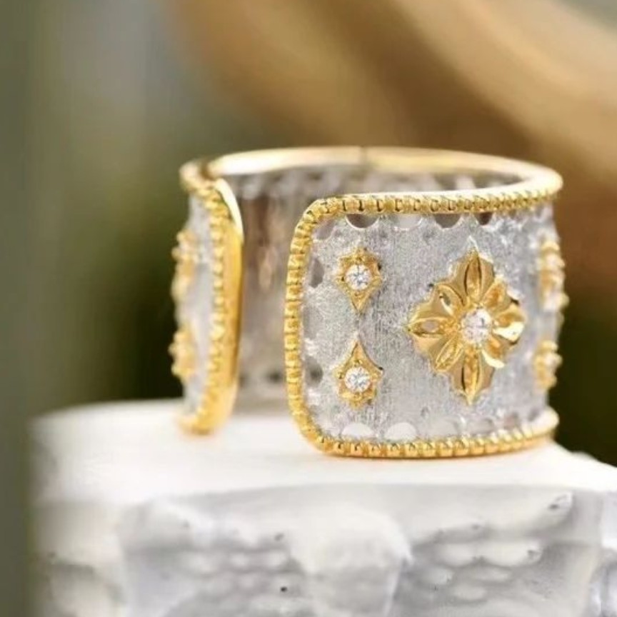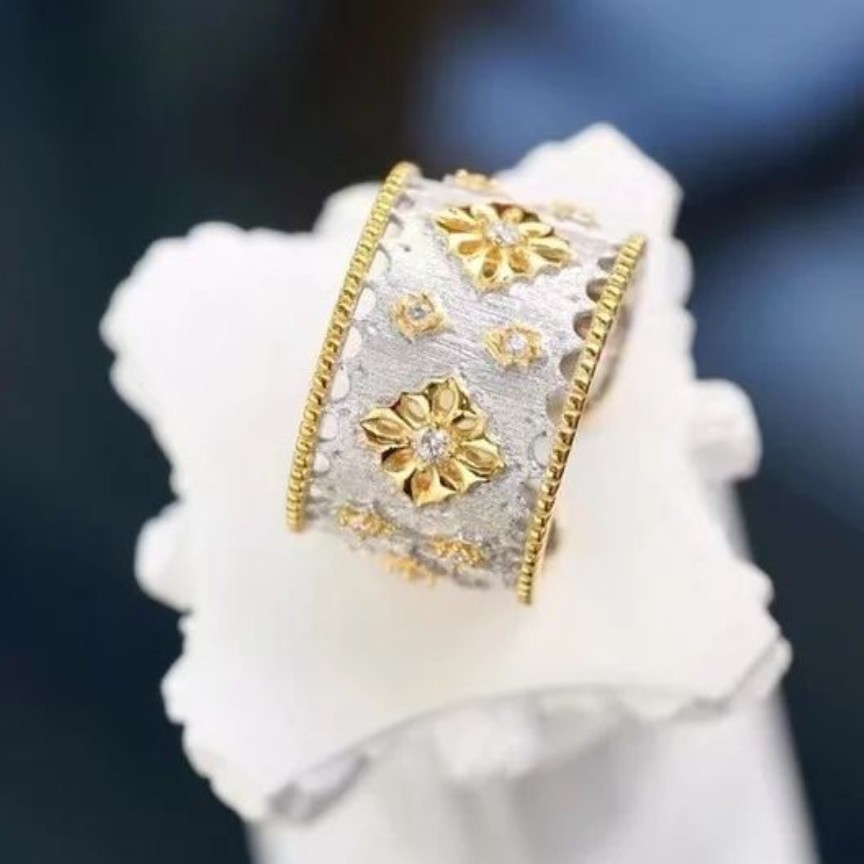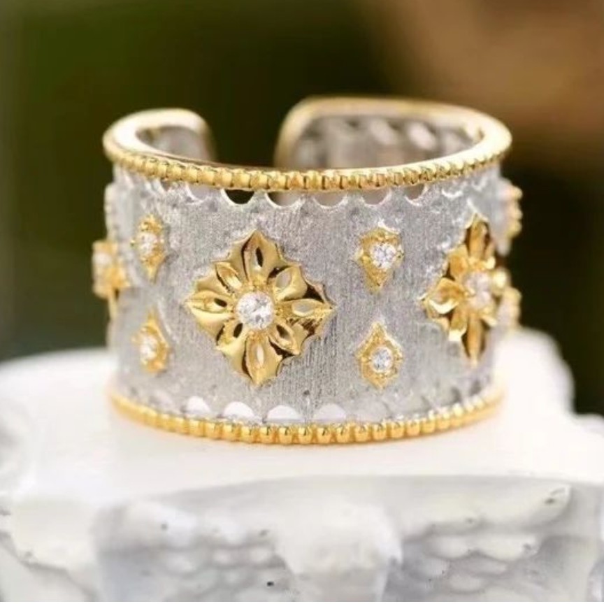 意大利工藝 BUCCELLATL 高級分色工藝系列 🔥🌸雪花戒指 🙈~師傅巧手鑲嵌,有種高級珠寶嘅vintage感覺。😘😘 中環地鋪隨隨便便都會賣1xxx!識貨快啲入手,本店只售599 925金鎏金拉絲雙色雪花高碳鑽戒指 925銀鎏金鑲嵌 實心 5老土。 保色強效,兩至三年 現代art deco設計 開口設計~ hkd$599 隻 包順豐自提櫃自取。